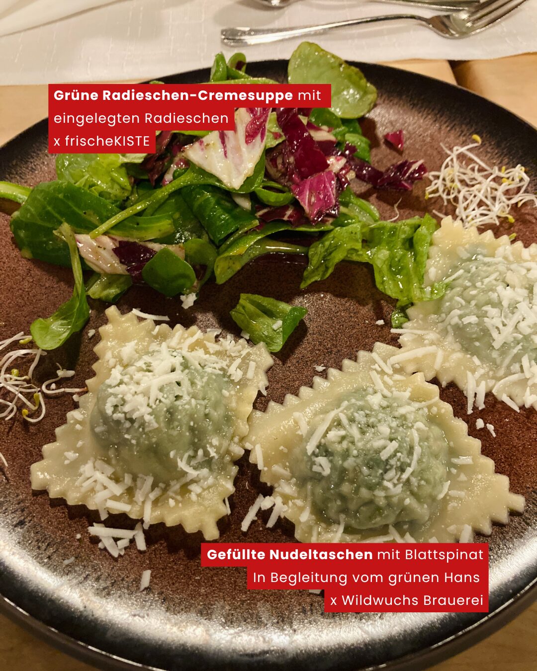 Zwar an dem Abend nicht persönlich mit dabei, aber trotzdem vertreten war die Wildwuchs Brauerei aus Hamburg, die wir uns von unseren lieben Hamburger Regionalwert Kollegen ausgeliehen haben. Zu den Gerichten gab es kleine Bier-Tastings und auch ein paar Tränen. Denn: Wildwuchs hat unter anderem eine wunderbare Sorte namens „To Absent Friends“ kreiert und erinnert uns damit an alle geliebten Menschen, die fehlen oder nicht mehr bei uns sind. Bittersüß, aber wunderschön.
