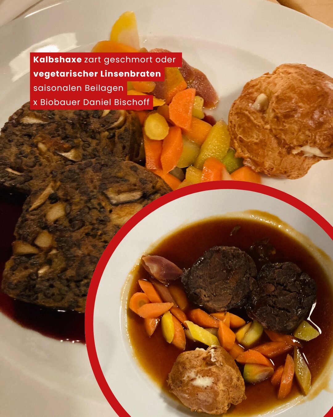 Die Kalbshaxe im Hauptgericht hätte auf jeden Fall zarter nicht geschmort werden können und kam super an. Für alle Vegetarier:innen gabs statt Kalb knusprigen Linsenbraten. Überraschend war der herzhaft gefüllte Windbeutel mit Frischkäse unseres Partnerbetriebs Die Ziegerei aus Asendorf. 10/10 für dieses tolle Gericht!