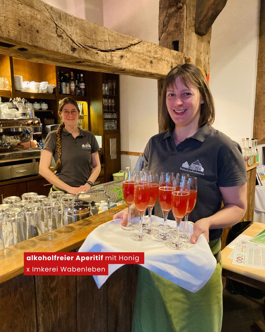 Unsere Gäste wurden mit einem leckeren alkoholfreien Honig-Aperitif in Empfang genommen. Der Honig war wie viele weitere Menü-Komponenten von der Imkerei Wabenleben aus Asendorf. Voständin Susanna Suhlrie eröffnete den Abend mit einer lockeren Begrüßung und ein paar Worten zu unserer Arbeit.