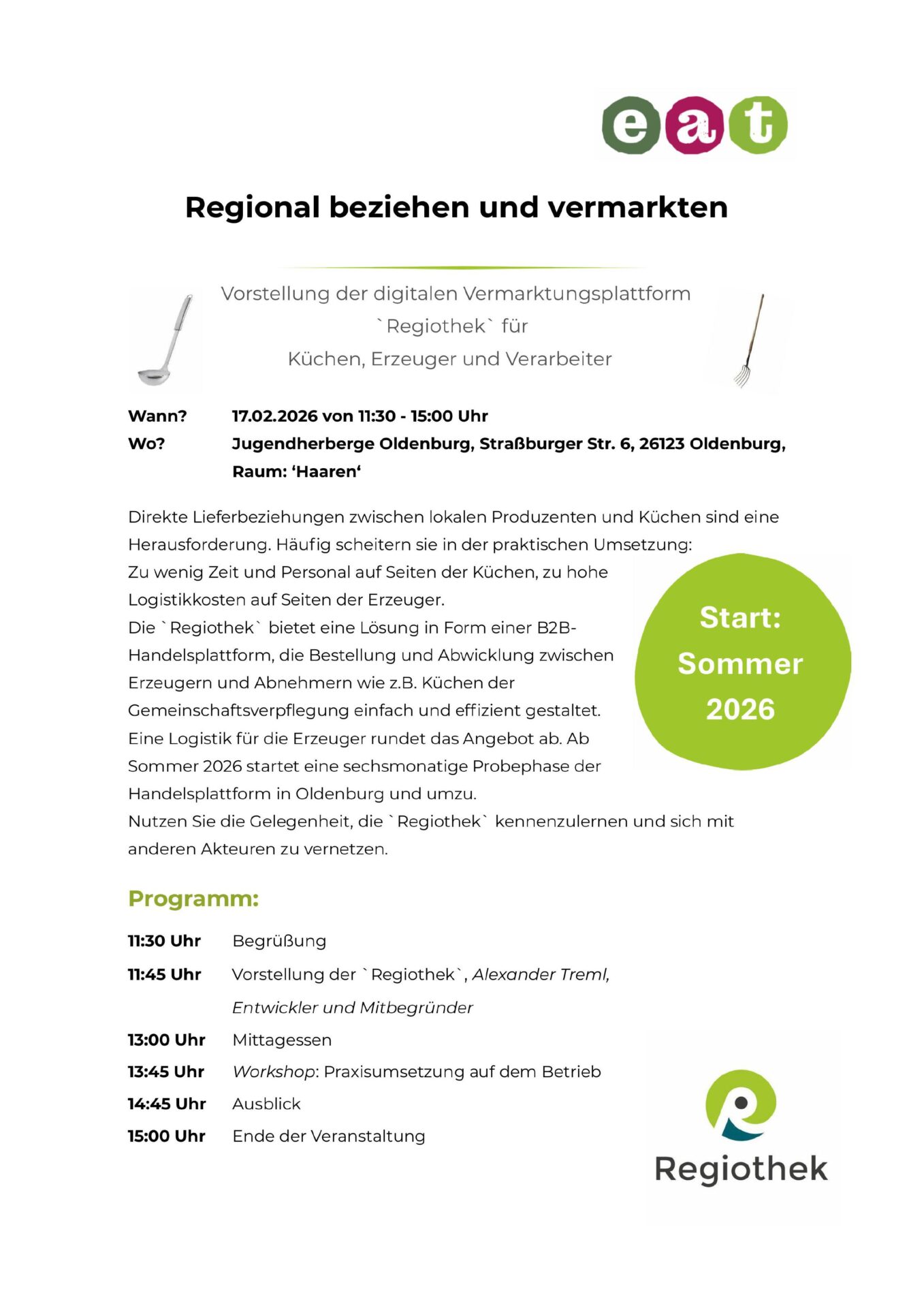 Die „Regiothek“ bietet eine Lösung in Form einer B2B-Handelsplattform, die Bestellung und Abwicklung zwischen Erzeugern und Abnehmern wie z.B. Küchen der Gemeinschaftsverpflegung einfach und effizient gestaltet. Eine Logistik für die Erzeuger rundet das Angebot ab. Ab Sommer 2026 startet eine sechsmonatige Probephase der Handelsplattform in Oldenburg und umzu.